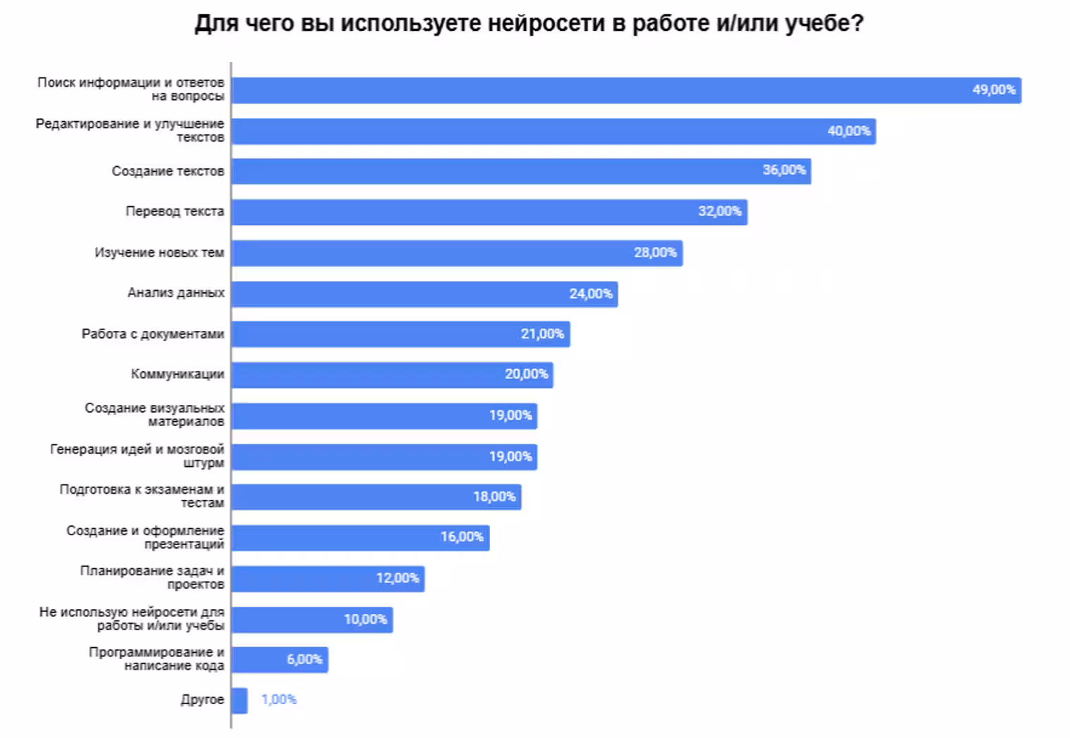 20% of users use neural networks for communication tasks, including preparing responses and correspondence. Creating visual materials is used by 19%. About the same proportion of respondents use AI for idea generation and brainstorming, as well as for preparing for exams and tests – 19% and 18%, respectively. Writing program code remains the least popular scenario, chosen by only 6% of survey participants.