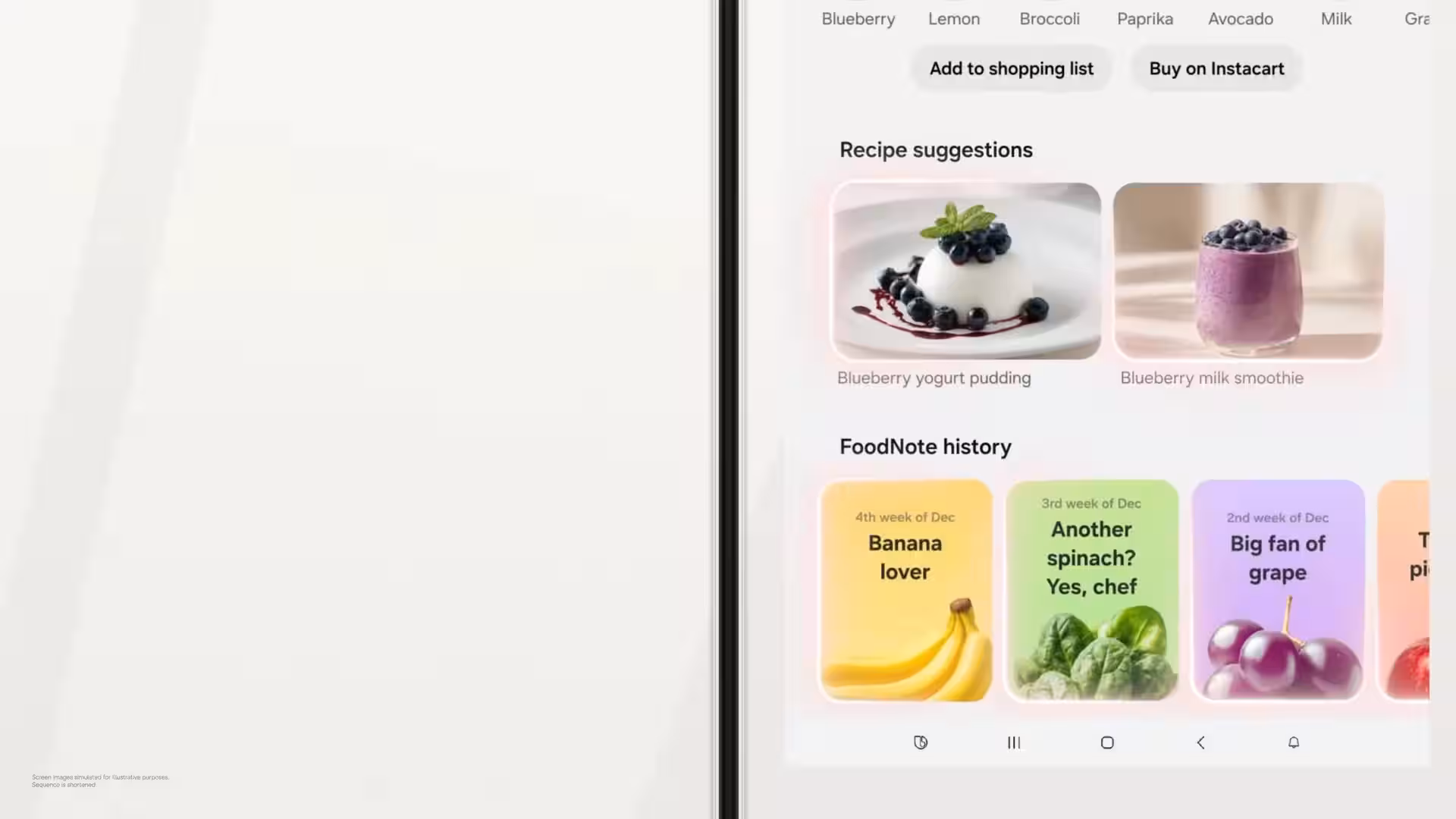 The fridge’s outer screen displays more widgets, grouped under Now Brief. The updated Bixby voice assistant recognizes the voices of different family members and shows personalized information like a calendar, health data from Samsung Health, photos, videos, Spotify playlists, news, weather forecasts, and recipe recommendations.