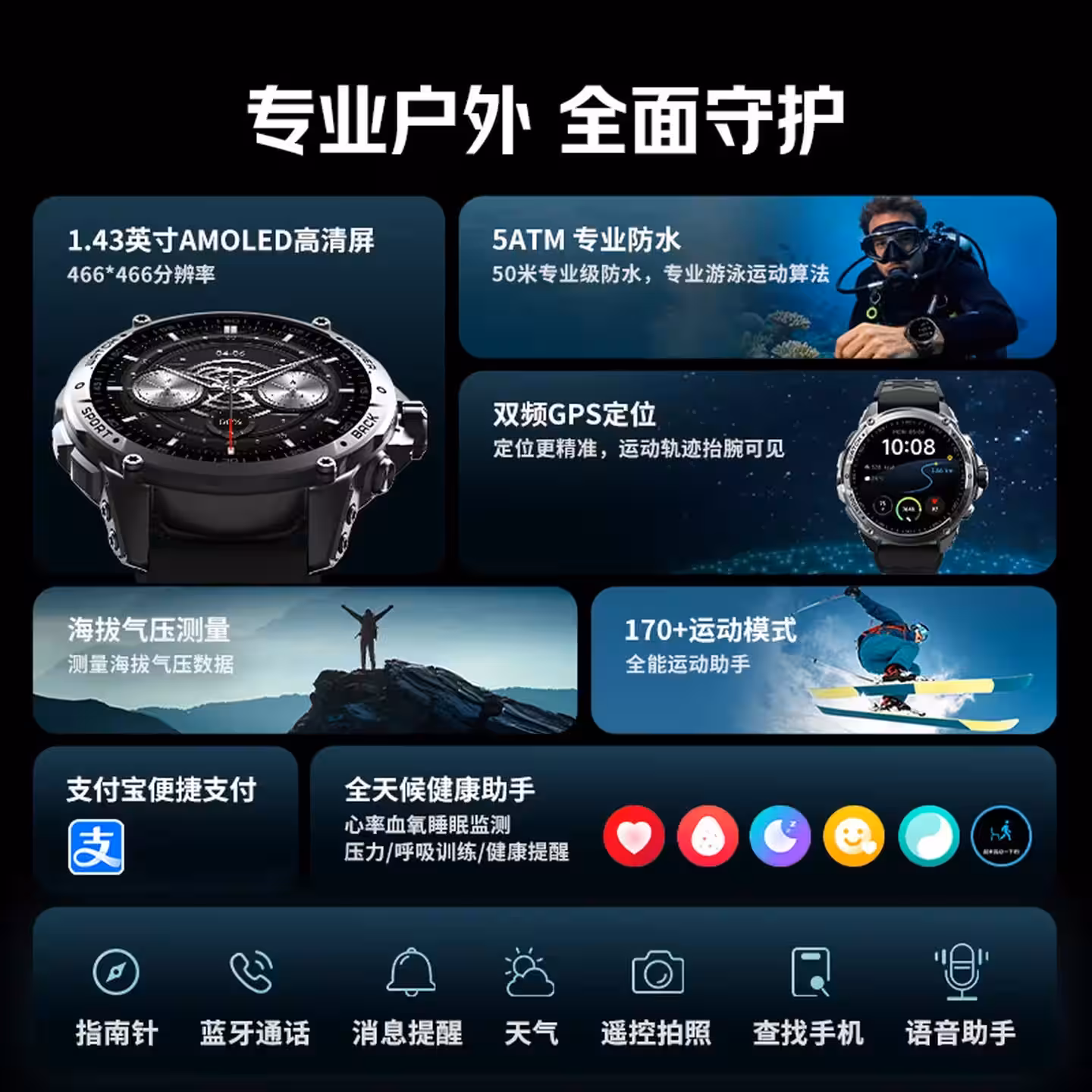 Watch GT Pro supports more than 170 sport modes, including indoor and outdoor workouts. With a 5ATM water resistance level, the watch can be used for swimming up to 50 meters. A separate algorithm for swimming tracks style, pace, laps, duration and calories burned.