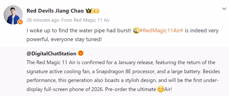 According to a well-known Digital Chat Station insider, the Red Magic 11 Air will be unveiled in China in January 2026. Jiang Chao reposted this information on Weibo and noted that the device will be very powerful indeed.