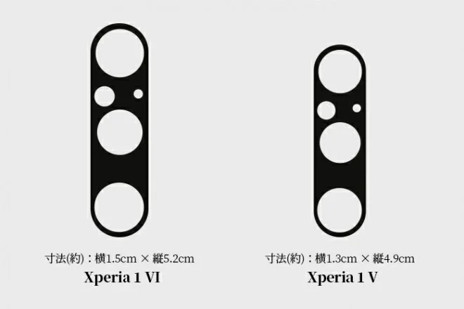 The images show the contours of the camera units of the new units compared to the current versions. The protector for the Xperia 1 VI measures 1.5×5.2 cm, which is larger than the previous model. The number of sensors will remain the same as its predecessor, including a flash and a microphone cutout.