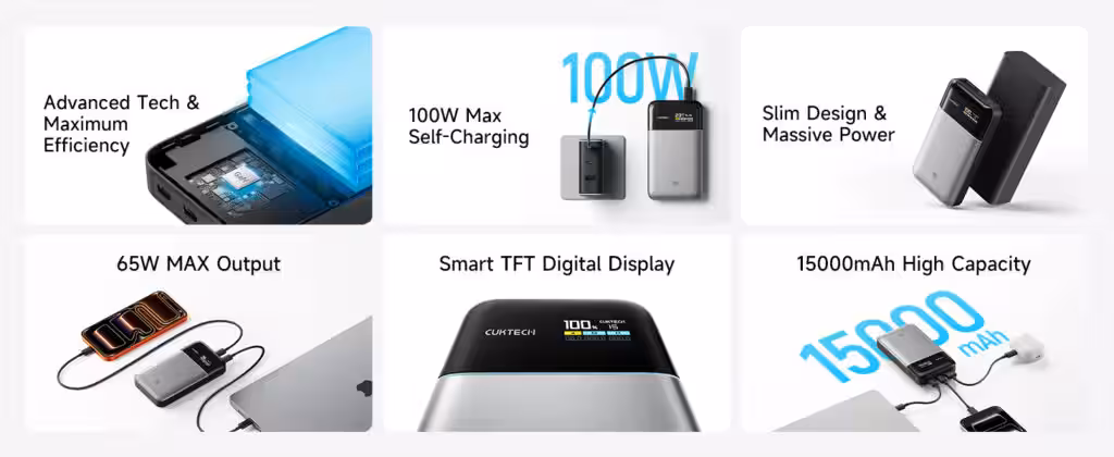 The device is less than 1 inch thick and weighs — about 306g, making the powerbank easy to fit in a backpack, laptop sleeve or even a jacket pocket. Cuktech emphasizes portability without sacrificing performance.